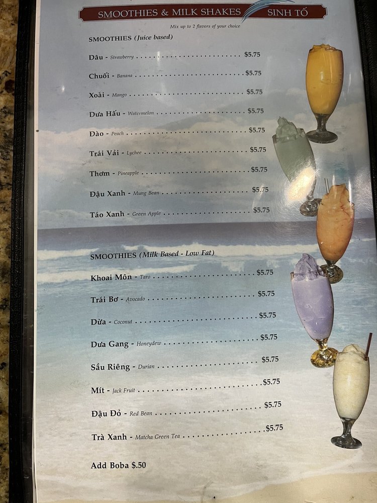 Introducing the menu at Ocean Pho, a casual eatery offering a variety of Vietnamese dishes in Yucaipa, CA. This spot prides itself on vegan and vegetarian options, smoothies, appetizers like egg rolls and grilled pork rolls, and a selection of pho bowls ranging from oxtail to filet mignon. Customers rave about the quality and flavor of their meals, with favorites including the barbecue pork, chicken pho, and taro boba. The restaurant is family-owned, with patrons praising the friendly service and cleanliness of the establishment. Those looking for a flavorful and satisfying dining experience should definitely check out Ocean Pho for a taste of authentic Vietnamese cuisine.